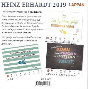 53 Postkarten (inkl. 1. Woche 2020), mit Aufstellvorrichtung. Die Wochen- und Monatsangaben an der unteren Seite der Postkarten können an der Perforation abgetrennt werden, sodass nur der/das jeweilige stilisierte Spruch/Gedicht auf der Postkarte zu sehen ist.