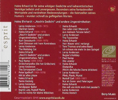 Den Machern dieser CD ist es gelungen, den Namen von Heinz Erhardt gleich zwei mal falsch zu schreiben; 'Erhard' auf der Rückseite der CD und 'Ehrhardt' im Innenteil des Covers. Das Cover suggeriert außerdem, dass es sich ausschließlich um Stücke von Heinz Erhardt handelt. Tatsächlich sind aber nur sieben der 22 Stücke von ihm. |